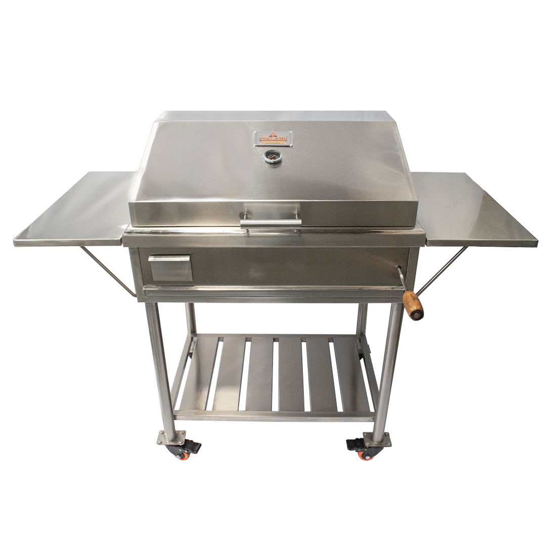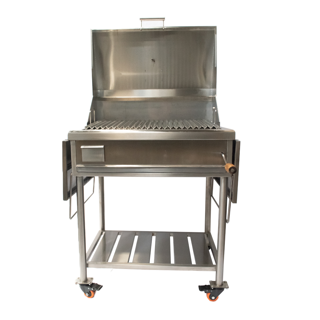 • Asador a carbón de acero inoxidable con aletas plegables.