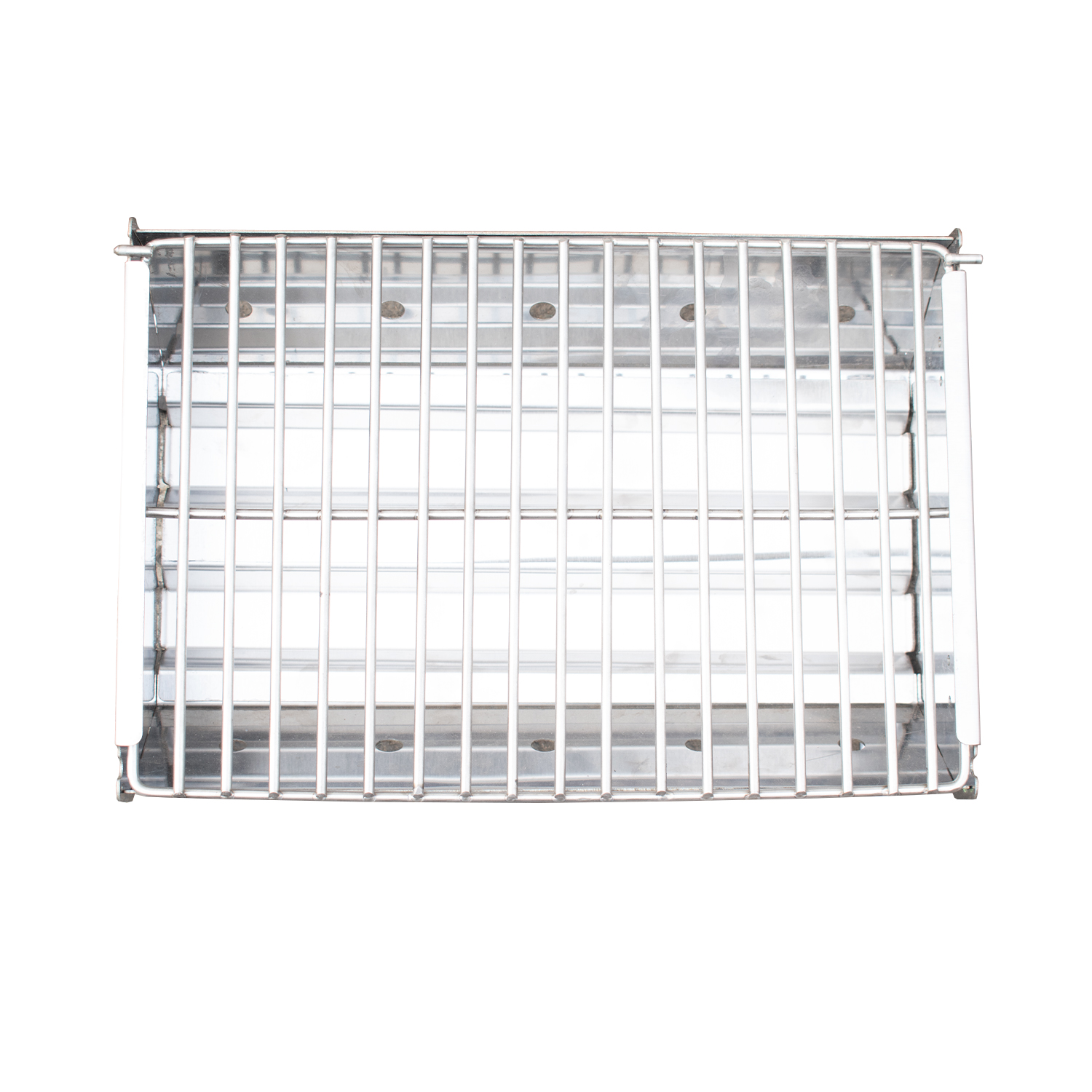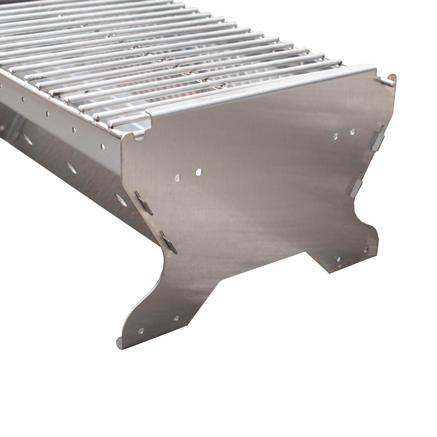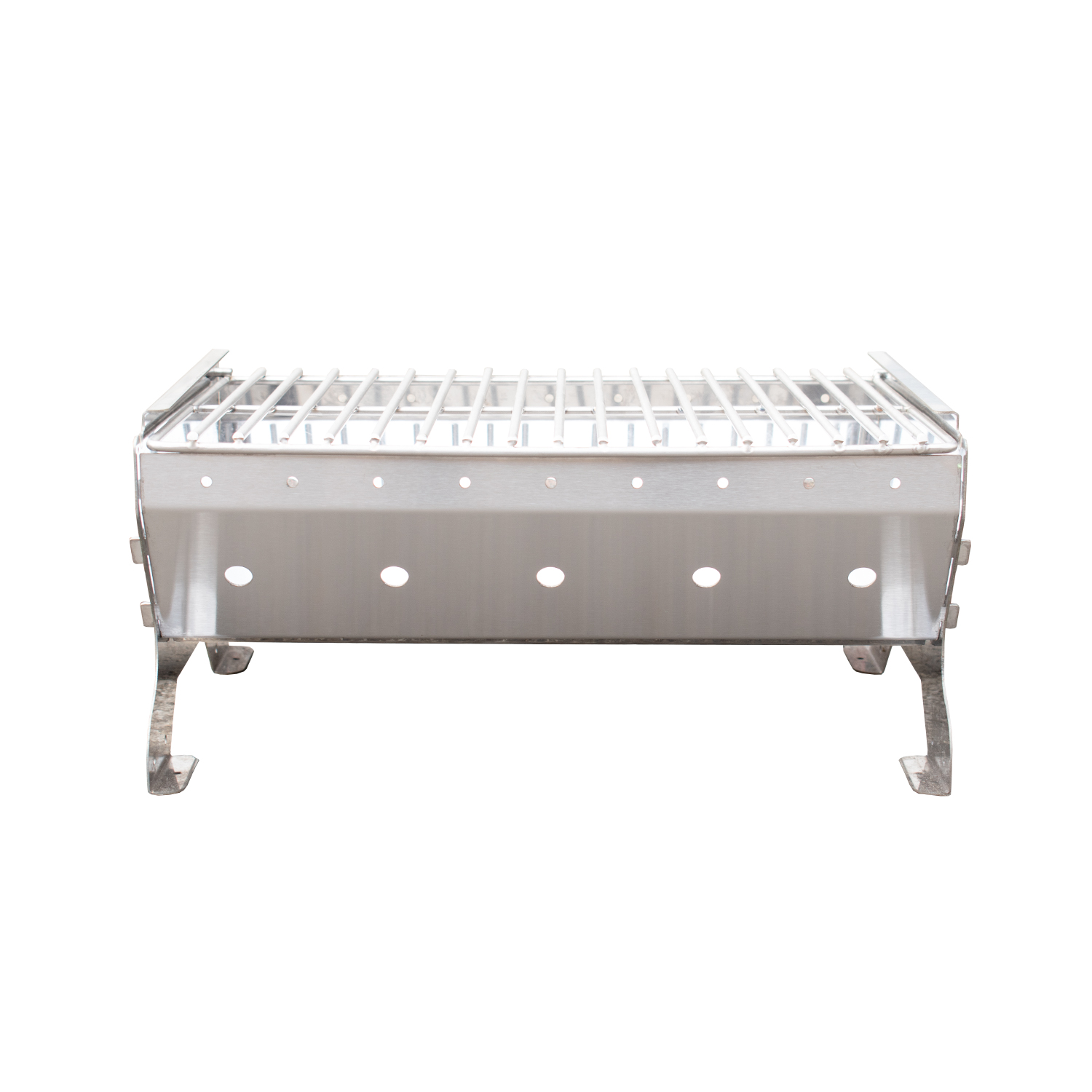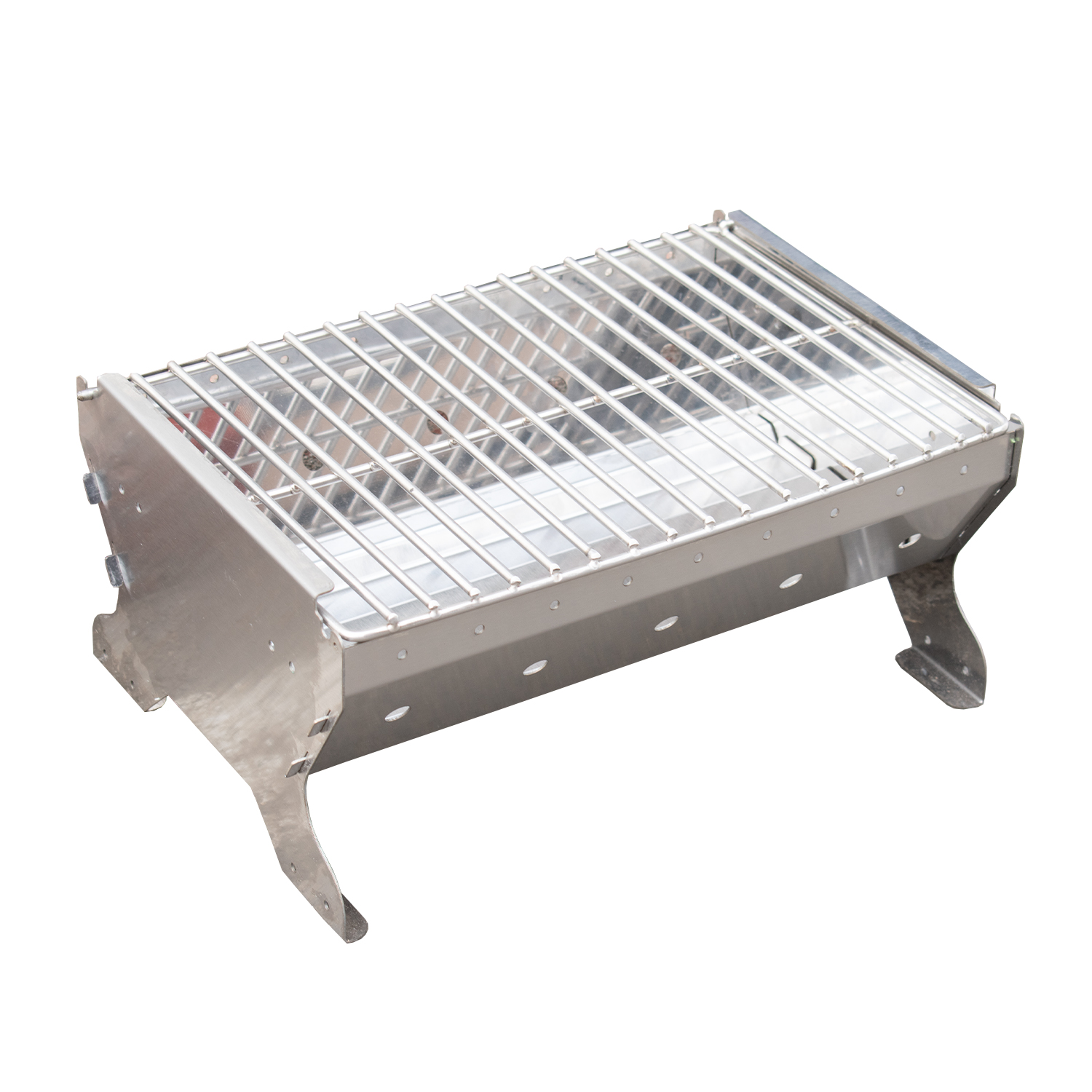 Asador portátil a carbón desarmable de acero, compacto y resistente. Con regulador de aire, manija y seguro de cierre para transporte práctico y combustión eficiente.