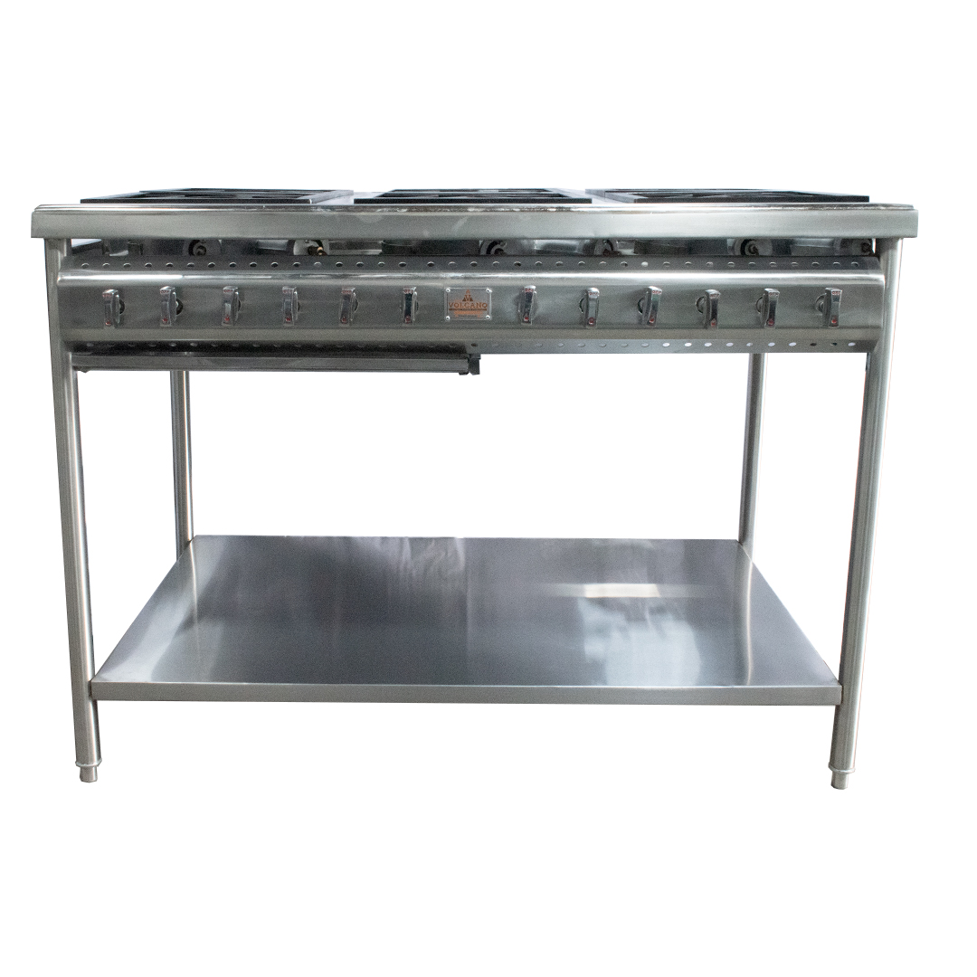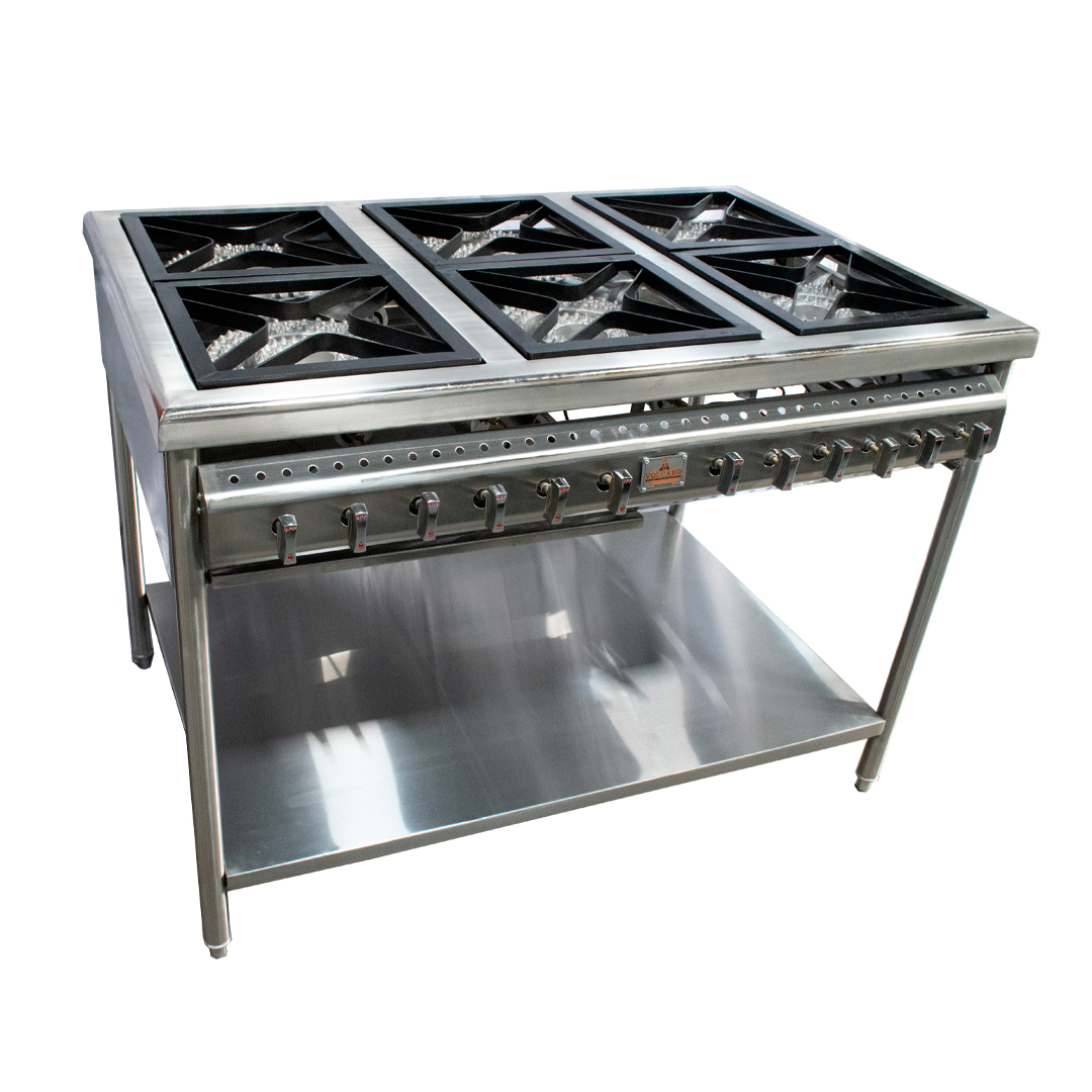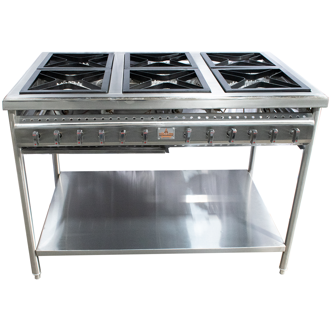 Estufa industrial de 6 puestos en acero inoxidable, de alto rendimiento, ideal para cocinas profesionales que requieren máxima capacidad y eficiencia.
