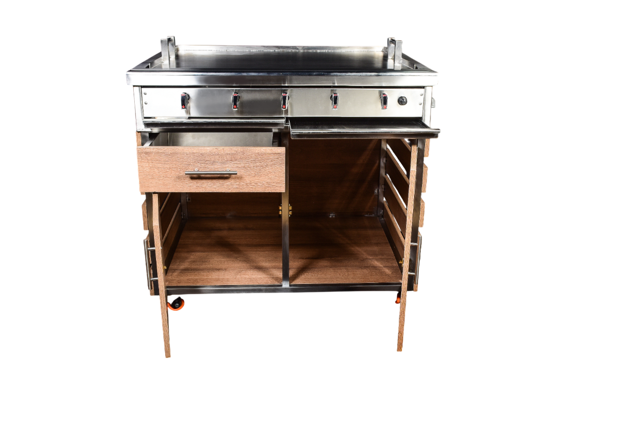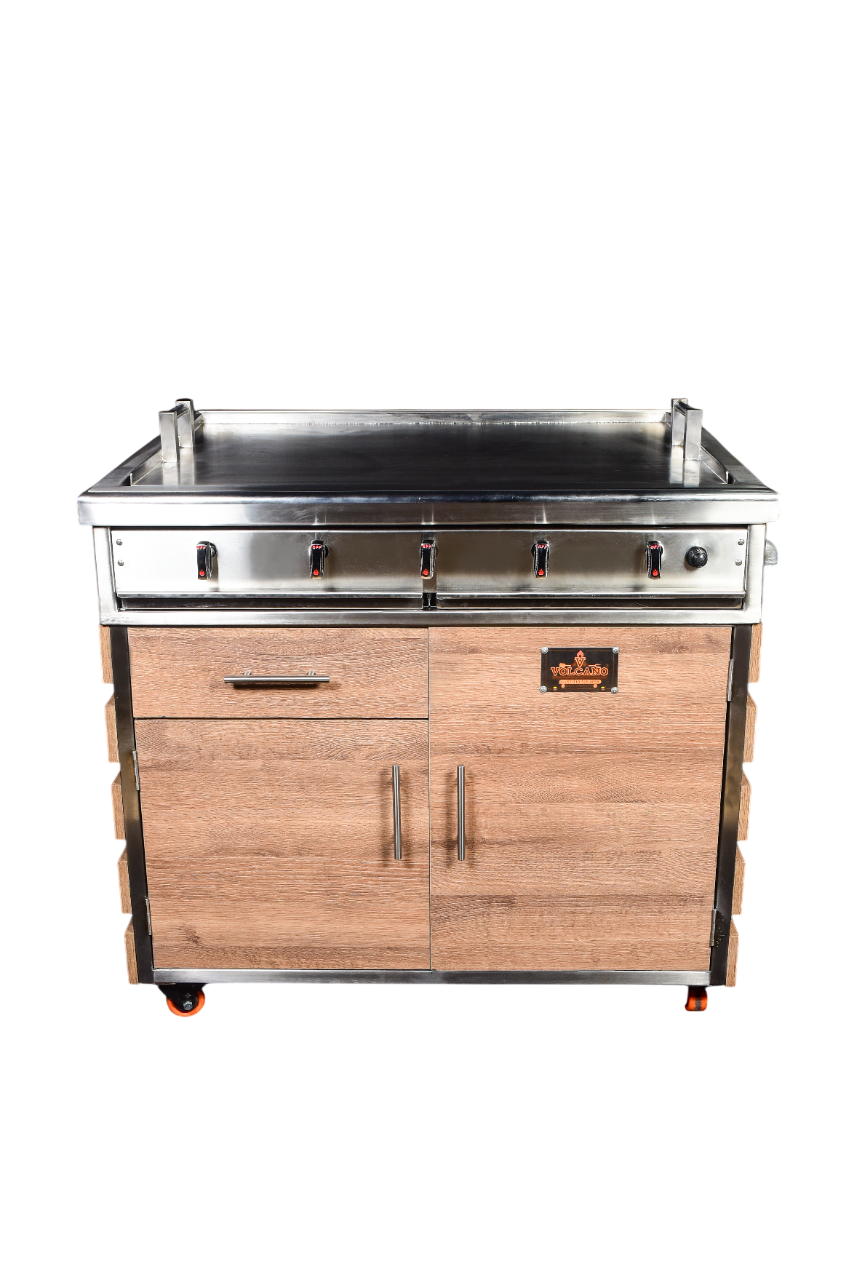 Su estructura resistente combina acero y acabados tipo madera, e incorpora perillas de control independientes para mayor precisión al cocinar. Además, incluye gabinete con puertas y cajón de almacenamiento para mantener utensilios y accesorios siempre organizados.